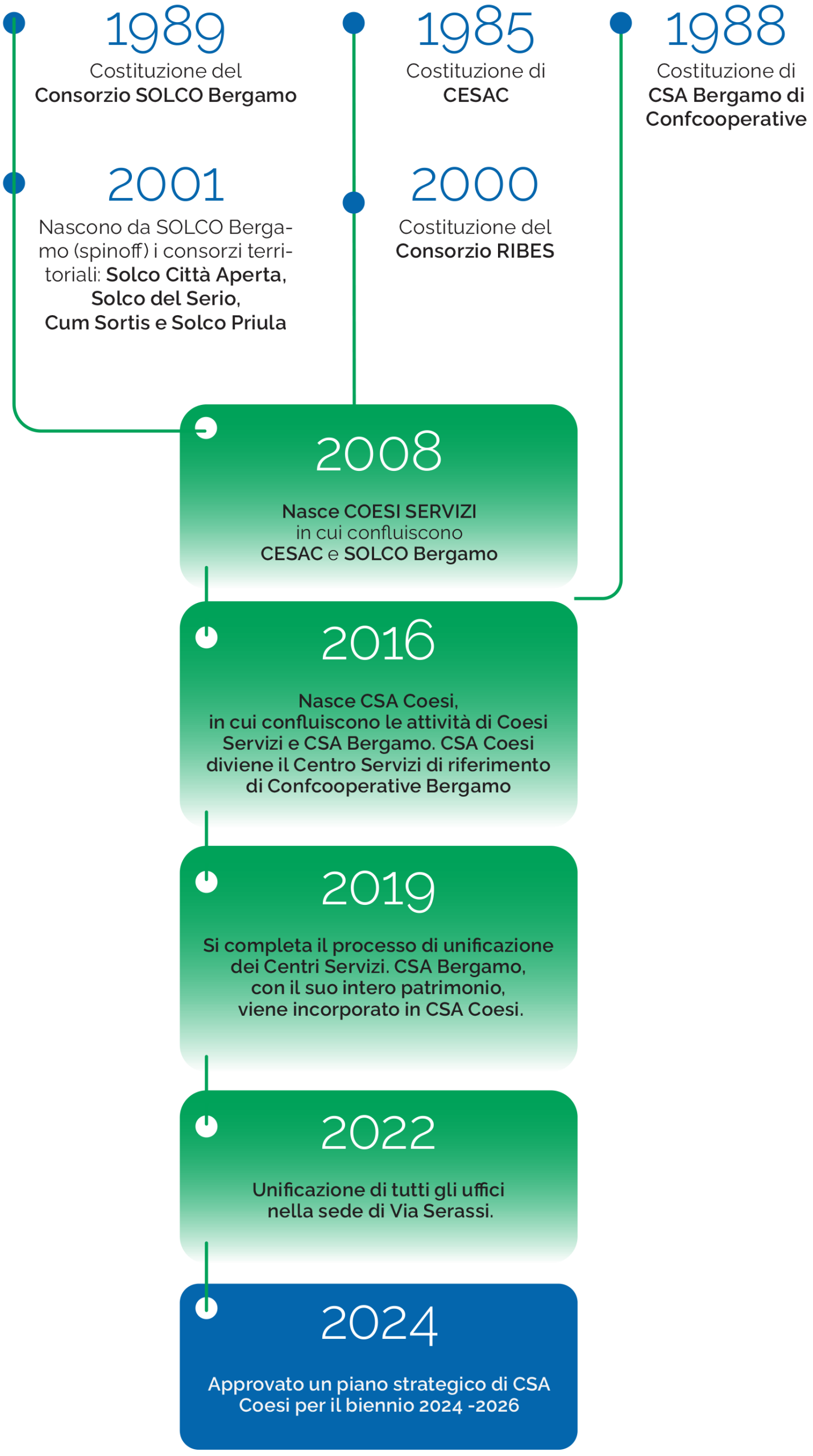 Nel corso del tempo, importanti realtà della cooperazione bergamasca, già consorzi e centri servizi, sono confluite in un unico soggetto, con l’obiettivo di mettere a fattore comune competenze e esperienze consolidate nel tempo e supportare così al meglio il ricco panorama della cooperazione e dell’economia.
